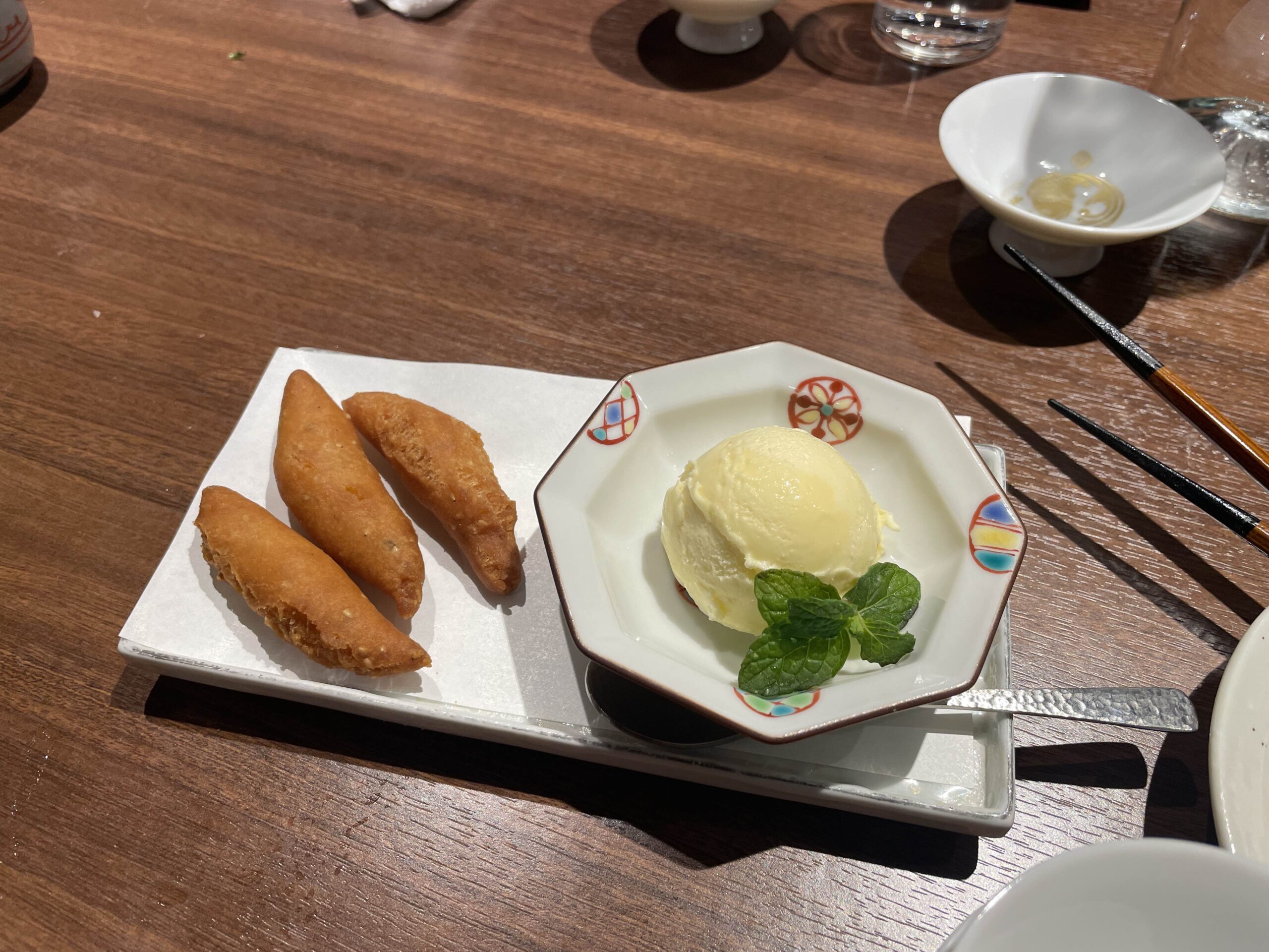 前菜4種(原木椎茸の胡麻炒め、しめじのフォレスティエール、秋田由利牛のタタキ、菜の花のお浸し)