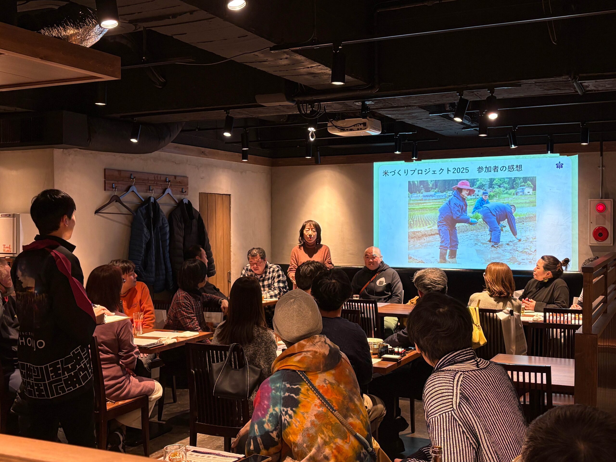 続いて行われた交流タイムでは、実際に収穫体験に参加された方々から、現地でのエピソードや感想が発表されました。 「自分たちで刈り取ったお米を食べるのが待ち遠しかった」 「泥んこになりながらの作業が、今では良い思い出」 といったリアルな声に参加者同士で共感したり、質問が飛び交ったりと、会場は和やかな雰囲気に包まれました。